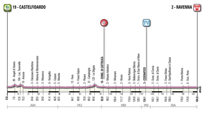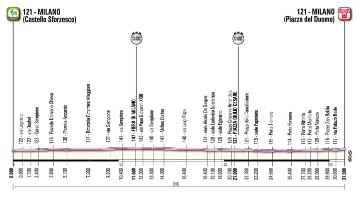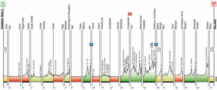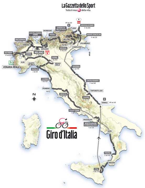 Die Rundfahrt beginnt am 7. Mai mit einem Mannschaftszeitfahren in Turin und endet am 29. Mai in Mailand mit einem flachen Einzelzeitfahren.