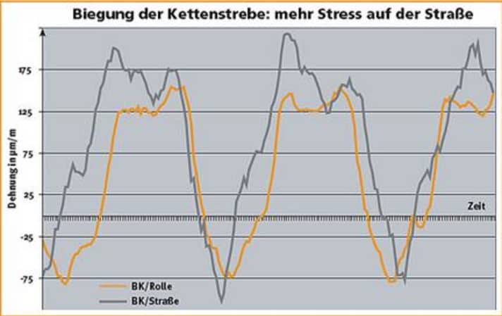 Beide Kurven zeigen die seitliche Biegung der rechten Kettenstrebe (BK) während der Tretbewegung, einmal auf der Rolle (gelb), einmal auf der Straße (grau). Tritt der Radsportler in die Pedale (hier mit rund 200 Watt), deformiert er den Rahmen je nach Kurbelstellung unterschiedlich stark. Deutlich erkennbar: Das Material dehnt sich beim Fahren auf der Straße stärker als auf der Rolle.