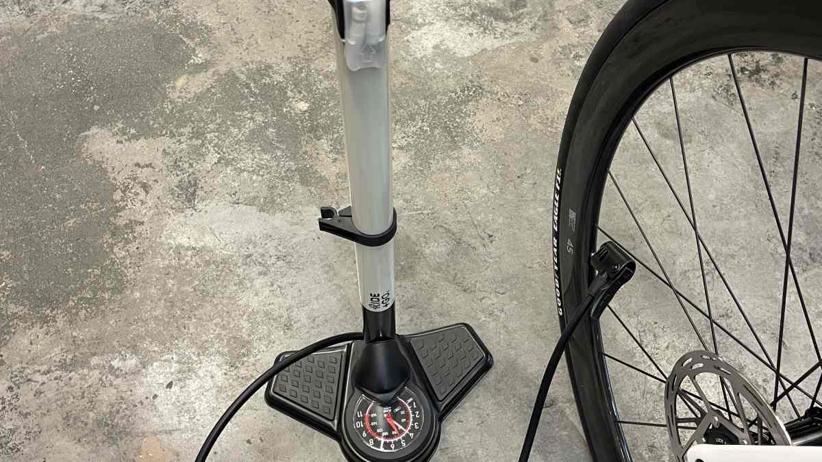 Die Minipumpe ist gut verarbeitet und mit 180 Gramm durchschnittlich schwer. Beim Pumpen arbeitet sie spielfrei, allerdings entsteht auf den ersten Zentimetern ein spürbarer Leerhub. Der Pumpenkopf sitzt sicher auf dem Ventil, doch der Feststellhebel schnellt beim Lösen kräftig zurück – das kann wehtun. Gravelreifen lassen sich zuverlässig aufpumpen, klassische Rennradreifen über fünf Bar schafft sie nicht. Praktisch sind die Halterung und das integrierte Griff‑Fach mit Reifenhebern und Flickzeug, auch wenn die kleinen Reifenheber für widerspenstige Reifen zu klein und schwach sind.