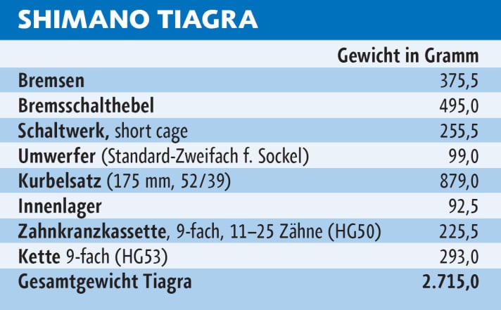 Fazit: Wenn rund 350 Gramm Mehrgewicht gegenüber der Ultegra egal sind, kann die Tiagra auch für sportlich ambitionierte Fahrer eine gute Wahl sein. Empfehlenswert außerdem für Fahrer älterer Shimano-Neunfach- Gruppen, die Ersatz für verschlissene Teile suchen.
