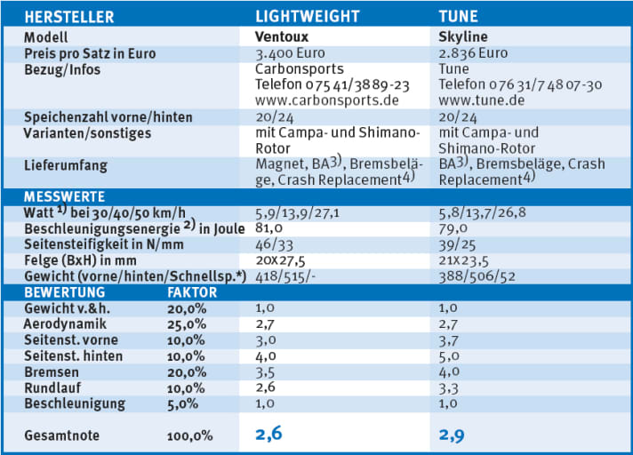 4) Beide Hersteller bieten Erstkäufern nach einer Registrierung so genannte Crash-Replacement-Garantien. Lightweight gewährt 30 Prozent Nachlass auf den Kaufpreis beim Ersatz von bei Unfällen irreparabel beschädigten Laufrädern. Tune gewährt bei den Skyline-Laufrädern 50 Prozent Nachlass auf den Felgenpreis beim Ersatz von bei Unfällen beschädigten Felgen.