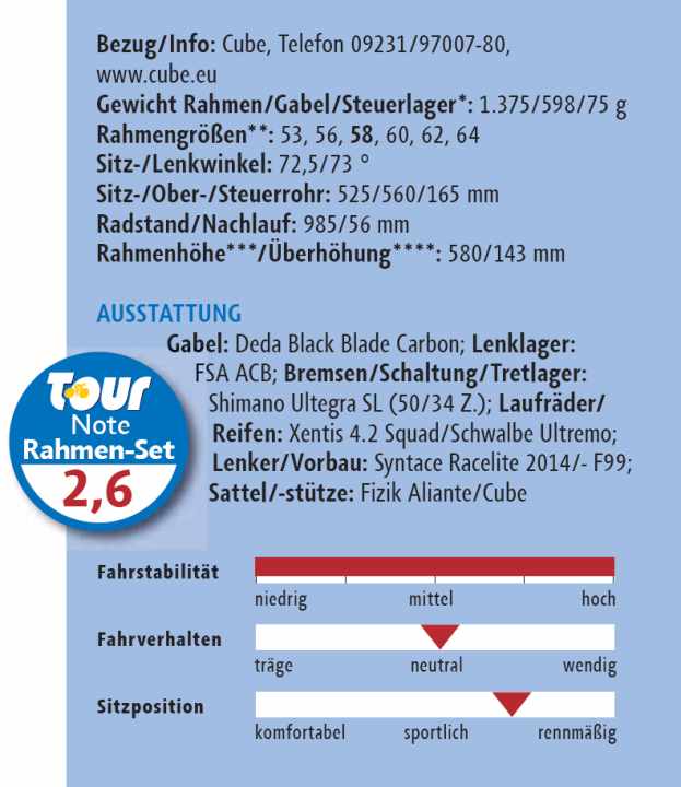 *Gewogene Gewichte; **Test-Rahmengröße gefettet; ***projiziertes Maß von Mitte Tretlager bis Oberkante Steuerrohr; ****Sattel- Steuerrohr-Überhöhung bei 75 cm Sitzhöhe (Mitte Sattelgestell – Oberkante Steuersatzkappe); 1) Preis Rahmen-Set; 2) normiertes Gewicht Rahmen-Set