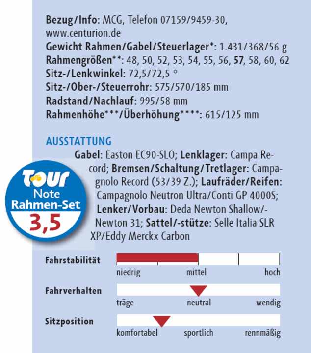 *Gewogene Gewichte; **Test-Rahmengröße gefettet; ***projiziertes Maß von Mitte Tretlager bis Oberkante Steuerrohr; ****Sattel- Steuerrohr-Überhöhung bei 75 cm Sitzhöhe (Mitte Sattelgestell – Oberkante Steuersatzkappe); 1) Preis Rahmen-Set; 2) normiertes Gewicht Rahmen-Set; 3) normiertes Gewicht Rahmen-Set; Preis Komplettrad
