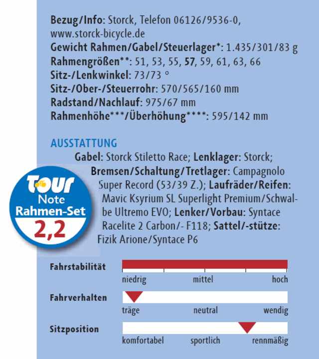 Das “Scenario Pro” gewinnt die Alu-Konkurrenz vor allem deshalb, weil er sich keinen gravierenden Ausrutscher in einer der Teildisziplinen erlaubt. Den geringen Rahmenkomfort machen sehr gute Steifigkeitswerte wett, während die extrem leichte und seitensteife Gabel befriedigenden Komfort vermittelt. Die edle Optik des klassischen Rahmen-Sets prägen sinnvoll dimensionierte Rahmenrohre mit schlicht runden Querschnitten. Das Finish der Schweißnähte und der Eloxalschicht ist perfekt, die pure Carbonstruktur der Gabel unterstreicht den technischen Anspruch, die nach hinten offenen Ausfallenden sind Storcks Markenzeichen. Auf der Straße lässt sich das “Scenario Pro” in jeder Fahrsituation spurtreu steuern, die Lenkung reagiert vergleichsweise träge.