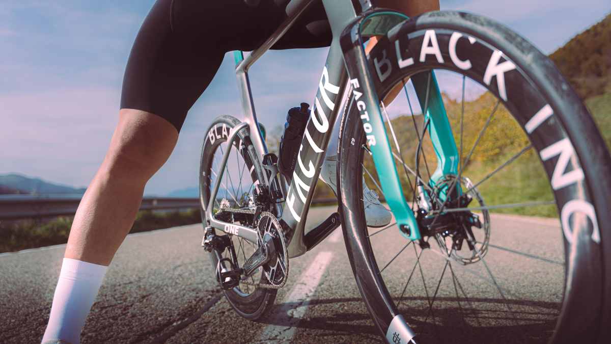 Im Windkanal schneidet das One auf Augenhöhe mit anderen bekannten Konstruktionen ab (Canyon Aeroad, Cervélo S5), kann sich aber nicht deutlich absetzen. Das ist eine leise Enttäuschung. Die außergewöhnliche Form bringt keinen messbaren Vorteil. Trotzdem ist das Rad absolut gesehen sehr schnell und lässt sich mit besserer Bereifung noch beschleunigen: Versuchsweise stecken wir einen Satz DT Swiss ARC 1100 65, bereift mit dem schlanken Conti Aero 111 in 26 Millimeter Breite, in das Rad. Damit durchbricht das Factor One die 200-Watt-Schwelle und landet bei 198,2 Watt. Ohne Umwerfer, den wir für das Experiment entfernen, schiebt sich das Rad auf 196,8 Watt – dorthin, wo es nach der Formensprache gehört.