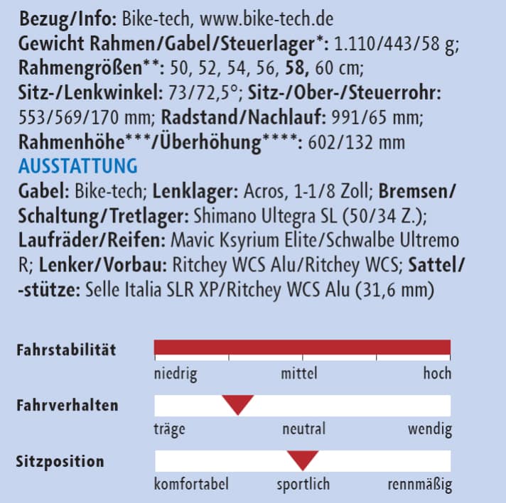 *Gewogene Gewichte; **Test-Rahmengröße gefettet; ***projiziertes Maß von Mitte Tretlager bis Oberkante Steuerrohr; ****Sattel-Steuerrohr-Überhöhung bei 75 cm Sitzhöhe (Mitte Sattelgestell – Oberkante Steuersatzkappe)