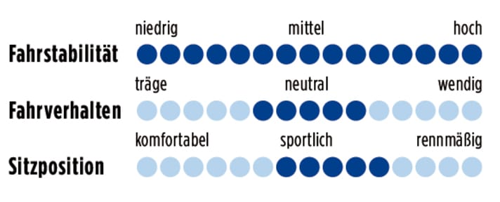 *Gewogene Gewichte; **Herstellerangabe, Testgröße gefettet; ***Stack/Reach: projiziertes senkrechtes/waagerechtes Maß von Mitte Tretlager bis Oberkante Steuersatzkappe; STR (Stack to Reach): Werte von 1,45 bis 1,55 bedeuten eine sportliche Sitzposition, Werte darunter rennmäßig, darüber komfortabel