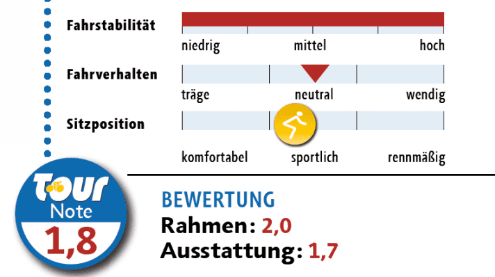 * gewogene Gewichte; ** Herstellerangabe, Testrahmengröße gefettet; *** Stack/Reach: projiziertes senkrechtes bzw. waagerechtes Maß von Mitte Tretlager bis Oberkante Steuersatzkappe; STR (Stack to Reach): Werte zwischen 1,45 und 1,55 bezeichnen eine sportliche Sitzposition, Werte darunter rennmäßig, darüber komfortabel