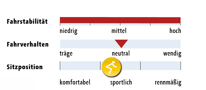 *Gewogene Gewichte; **Herstellerangabe; Testrahmengröße gefettet; ***Stack/Reach: projiziertes senkrechtes bzw. waagerechtes Maß von Mitte Tretlager bis Oberkante Steuersatzkappe