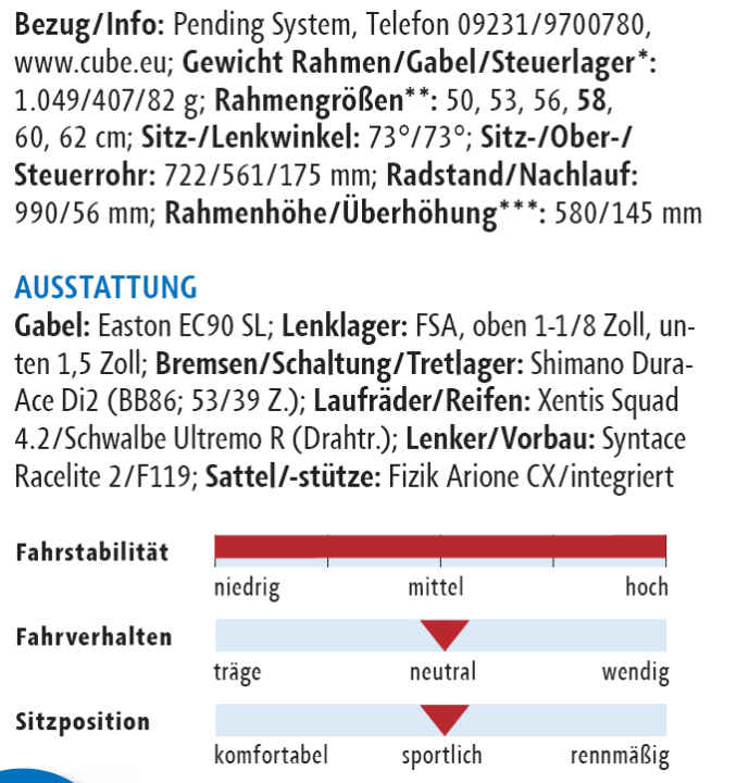 Aus einem Guss präsentiert sich das “Litening Super HPC Di2”, in das Cube alles reingepackt hat, was im Rahmenbau angesagt ist. Die Kurbeln drehen sich um eingepresste Lager, der Sattel thront auf einer integrierten Sattelstütze, die Gabel hat einen konischen Schaft. Vorbildlich die Integration der Di2: Keine Schaltzüge trüben die Optik, die Kabel verlaufen im Rahmen, der Akku sitzt dezent unter der linken Kettenstrebe. Tadellos auch die Fahreigenschaften. Dank hoher Steifigkeitswerte liegt das Rad sicher auf der Straße, das Lenkverhalten ist ausgewogen. Die Sattelstütze nimmt Fahrbahnunebenheiten spürbar die Spitzen. Die Carbonlaufräder für Drahtreifen von Xentis bremsen bei Trockenheit über raschend gut, quietschen dabei allerdings hörbar und sind für den Werkstoff recht schwer. Die Sitzposition zielt auf sportlich orientierte Fahrer.
