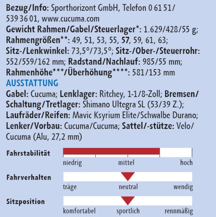 *Gewogene Gewichte; **Test-Rahmengröße gefettet; ***projiziertes Maß von Mitte Tretlager bis Oberkante Steuerrohr; ****Sattel-Steuerrohr-Überhöhung bei 75 cm Sitzhöhe (Mitte Sattelgestell – Oberkante Steuersatzkappe)