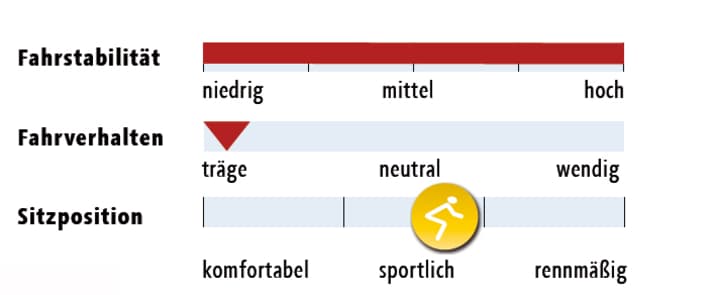 *Gewogene Gewichte; **Herstellerangabe; Testrahmengröße gefettet; ***Stack/Reach: projiziertes senkrechtes bzw. waagerechtes Maß von Mitte Tretlager bis Oberkante Steuersatzkappe