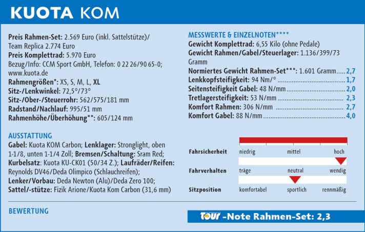 Zwei Kritik-Punkte, die weniger den Rahmen als die Ausstattung des Testrades betreffen: Der steife Newton-Lenker von Deda – ein bewährter Alu-Klassiker, den schon Lance Armstrong bei seinen Tour- Siegen pilotierte – verstärkt in Kombination mit dem dünnen Lenkerband und der Hochprofilfelge von Reynolds den harten Fahreindruck am Lenker. Die für Schlauchreifen ausgelegten Carbon-Laufräder von Reynolds erreichten uns schlecht zentriert. Wegen eines Seitenschlags touchierte die Hinterradfelge im Wiegetritt die Bremsbeläge. Fraglich auch, warum die aerodynamisch guten Felgen mit Rundspeichen eingespeicht wurden, die den Vorteil der hohen Felgen im Kampf gegen den Wind zum Teil wieder aufzehren. Solche Details lassen sich allerdings durch eine andere Ausstattung individuell verändern. Das Rahmen-Set kostet inklusive Sattelstütze 2.569 Euro, im Agritubel-Dekor 2.774 Euro. In der gezeigten Ausstattung verlässt das KOM für stolze 5.970 Euro den Laden. Eine teure, aber reizvolle Versuchung.