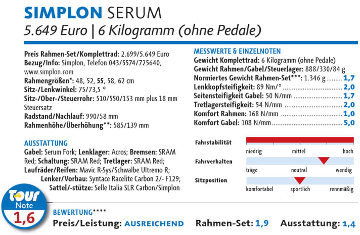 Simplons Ausstattungsbaukasten hält für das “Serum” acht Varianten bereit, Gruppen von Campagnolo, Shimano und SRAM können mit diversen Laufrädern kombiniert werden, sodass die Preisspanne von 3.599 Euro mit Shimanos “Ultegra” bis zu 6.399 Euro mit Campas neuer “Super Record” reicht. Unser sechs Kilo schweres Testrad mit SRAMs Top-Gruppe “Red” kostet 5.649 Euro. Nach Bestellung beim Händler verspricht Simplon eine Lieferzeit von lediglich einer Woche.