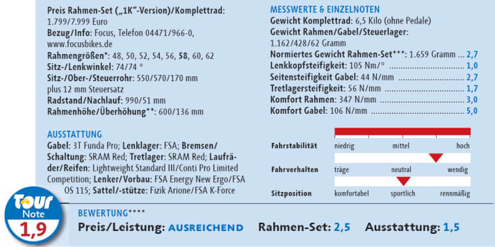 *Testrad-Rahmengröße gefettet; **projiziertes Maß von Mitte Tretlager bis Oberkante Steuerrohr/Sattel- Steuer rohrüber höhung bei 75 cm Sitzhöhe (Mitte Sattelgestell–Oberkante Steuersatzdeckel); ***bereinigtes Gewicht für Rahmengröße 57 und Gabelschaftlänge 225 mm; ****in die Note fließen weitere Einzelnoten ein, die wir aus Platzgründen nicht abdrucken können. Die Ausstattung geht bei Kompletträdern mit 60 Prozent in die Endnote ein.