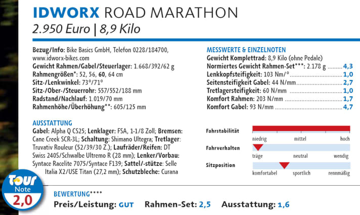 *Testrad-Rahmengröße gefettet; **projiziertes Maß von Mitte Tretlager bis Oberkante Steuerrohr/Sattel- Steuer rohrüber höhung bei 75 cm Sitzhöhe (Mitte Sattelgestell–Oberkante Steuersatzdeckel); ***bereinigtes Gewicht für Rahmengröße 57 und Gabelschaftlänge 225 mm; ****in die Note fließen weitere Einzelnoten ein, die wir aus Platzgründen nicht abdrucken können. Die Ausstattung geht bei Kompletträdern mit 60 Prozent in die Endnote ein.
