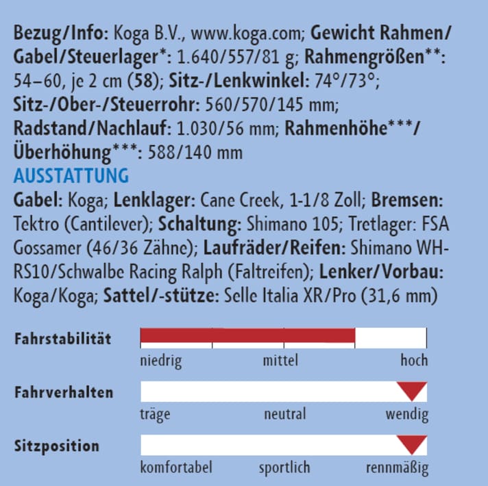 *Gewogene Gewichte; **Test-Rahmengröße gefettet; ***projiziertes Maß von Mitte Tretlager bis Oberkante Steuerrohr75 ****Sattel-Steuerrohr-Überhöhung bei 75 cm Sitzhöhe (Mitte Sattelgestell – Oberkante Steuersatzkappe)