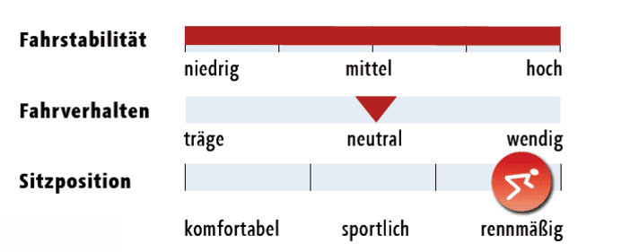 *Gewogene Gewichte; **Herstellerangabe; Testrahmengröße gefettet; ***Stack/Reach: projiziertes senkrechtes bzw. waagerechtes Maß von Mitte Tretlager bis Oberkante Steuersatzkappe