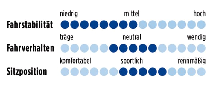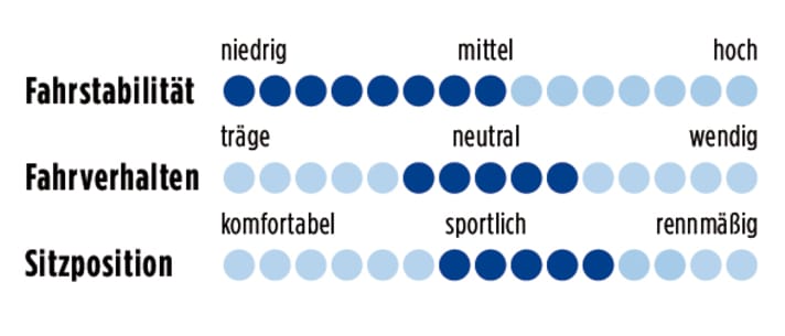 *Gewogene Gewichte. **Herstellerangabe, Testgröße gefettet. ***Stack/Reach: projiziertes senkrechtes/waagerechtes Maß von Mitte Tretlager bis Oberkante Steuersatzkappe; STR (Stack to Reach): Werte von 1,45 bis 1,55 bedeuten eine sportliche Sitzposition, Werte darunter rennmäßig, darüber komfortabel.