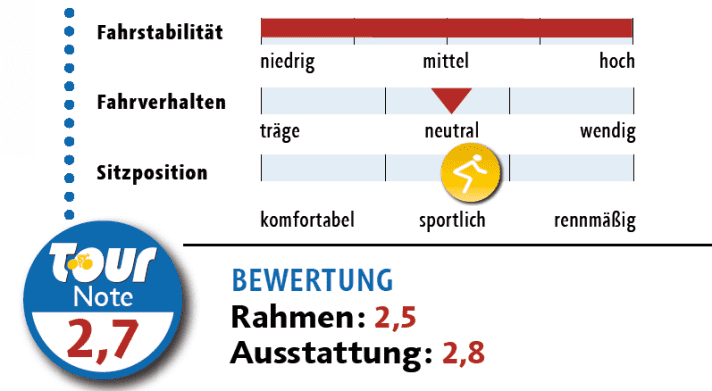 *Gewogene Gewichte; **Herstellerangabe, Testrahmengröße gefettet; ***Stack/Reach: projiziertes senkrechtes bzw. waagerechtes Maß von Mitte Tretlager bis Oberkante Steuersatzkappe; STR: (Stack to Reach) Werte zwischen 1,45 und 1,55 bezeichnen eine sportliche Sitzposition, Werte darunter rennmäßig, darüber komfortabel.