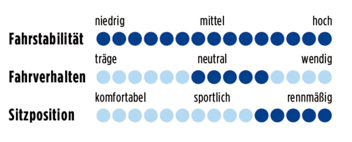 *Gewogene Gewichte; **Herstellerangabe, Testgröße gefettet; ***Stack/Reach: projiziertes senkrechtes/waagerechtes Maß von Mitte Tretlager bis Oberkante Steuersatzkappe; STR (Stack to Reach): Werte von 1,45 bis 1,55 bedeuten eine sportliche Sitzposition, Werte darunter rennmäßig, darüber komfortabel