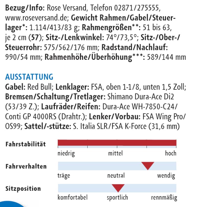 *Gewogene Gewichte; **Testrahmengröße gefettet; ***Rahmenhöhe: projiziertes Maß von Mitte Tretlager bis Oberkante Steuerrohr; Überhöhung: Sattel-Steuerrohr-Überhöhung bei 75 cm Sitzhöhe (Mitte Sattelgestell – Oberkante Steuersatzkappe)
