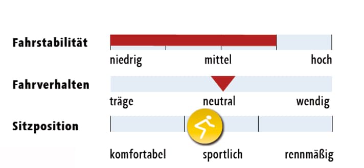 *Gewogene Gewichte; **Herstellerangabe; Testrahmengröße gefettet; ***Stack/Reach: projiziertes senkrechtes bzw. waagerechtes Maß von Mitte Tretlager bis Oberkante Steuersatzkappe
