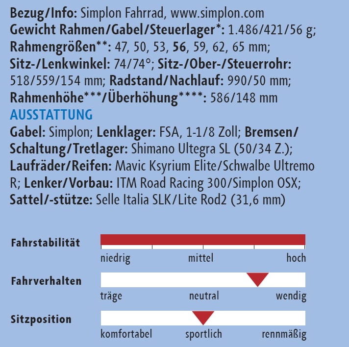 Wer bei Simplon 2.240 Euro anlegen möchte, dem empfiehlt der österreichische Hersteller nicht einen seiner hervorragenden Carbonrahmen, sondern den bewährten, soliden Alu-Rahmen “Phasic”. Der glänzt zwar nicht durch ausgefallene Details, ist dafür aber ein jederzeit zuverlässiger Begleiter durch dick und dünn. Dank hoher Fahrstabilität ist er zudem eine gute Empfehlung für schwere Fahrer. Aufgebaut mit durchweg hochwertigen Komponenten wie Shimanos “Ultegra” und “Ksyrium Elite”-Laufrädern von Mavic, bringt es das Rad auf konkurrenzfähige 7,7 Kilo. Nicht jedermanns Sache dürfte der “SLK”-Sattel von Selle Italia sein, dessen ausgefallene Form eine längere Gewöhnungszeit erfordert. Da Simplon jedes Rad nach Kundenwunsch komplettiert, lässt sich dies durch Wahl einer anderen Sitzgelegenheit jedoch leicht ändern.