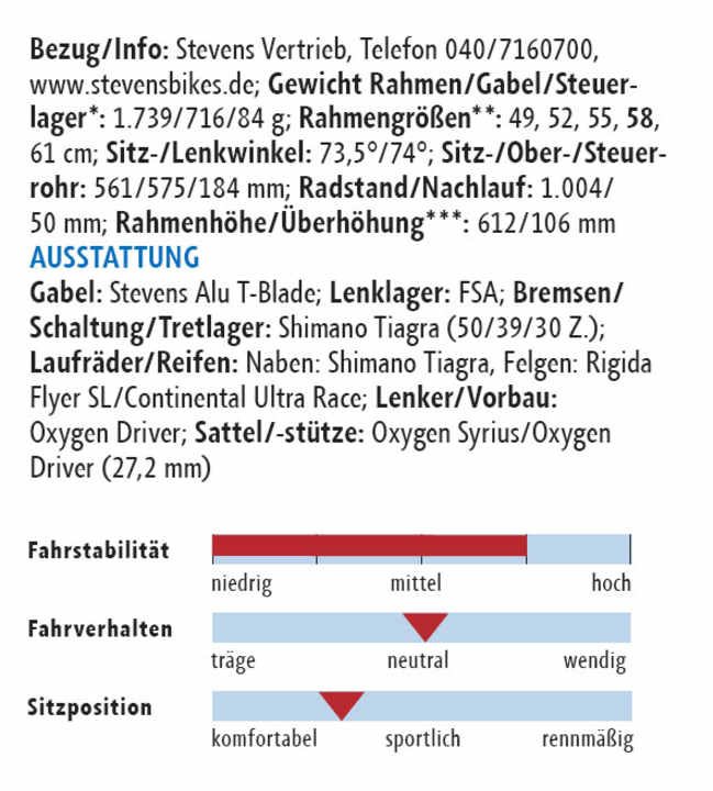 *Gewogene Gewichte; **Testrahmengröße gefettet; ***Rahmenhöhe: projiziertes Maß von Mitte Tretlager bis Oberkante Steuerrohr; Überhöhung: Sattel-Steuerrohr-Überhöhung bei 75 cm Sitzhöhe (Mitte Sattelgestell – Oberkante Steuersatzkappe).
