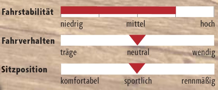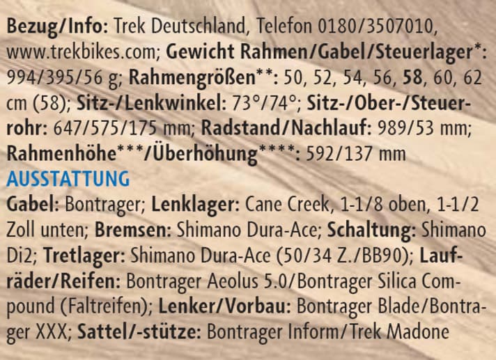 *gewogene Gewichte; ** Testrahmengröße gefettet; *** projiziertes Maß von Mitte Tretlager bis Oberkante Steuerrohr; **** Sattel-SteuerrohrÜberhöhung bei 75 cm Sitzhöhe (Mitte Sattelgestell – Oberkante Steuersatzkappe)
