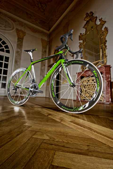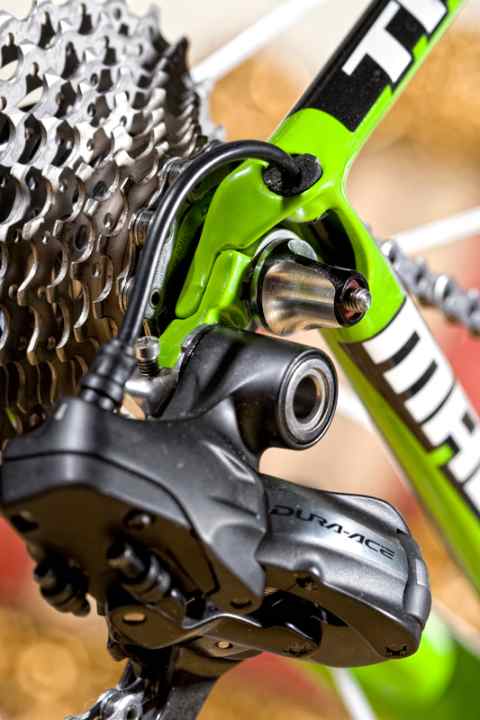 Außer dem sehr guten Komfortwert am Sattel bietet das Rad zwar in keiner Disziplin überragende technische Werte, doch die Mischung stimmt. 1.450 Gramm für das üppig lackierte Rahmen-Set sind sehr gut, alle Steifigkeitswerte liegen im grünen Bereich. In der getesteten “Pro-Fit”-Version mit sportlicher Geometrie – es gibt auch eine mit längerem Steuerrohr für eine bequemere Sitzposition – fährt sich das Rad traumhaft agil und spritzig. Die Sattelstütze wird weiterhin über einen Stutzen auf dem Rahmen geklemmt, das Komfort potenzial dieser Lösung wird aber deutlich besser genutzt als bisher. Neu ist der elegant in der linken Kettenstrebe versteckte Sensor, der kabellos die Signale für Geschwindigkeit und Trittfrequenz an den Computer sendet; das System soll mit den meisten gängigen Rad-Computern kompatibel sein. Trek verwendet den eigenen “BB90”-Tretlagerstandard, Lager für andere Kurbeln sind lieferbar. Alle Züge verlaufen im Rahmen, der auch die Stromkabel für Shimanos elektronische “Di2”-Schaltung aufnehmen könnte. Etwas enttäuschend: die 1.634 Gramm schweren, nicht sehr steifen Carbonlauf räder von Bontrager, die den Werkstoff nicht optimal nutzen. Im riesigen Trek-Baukasten gibt es jedoch zahlreiche Laufrad-Optionen.