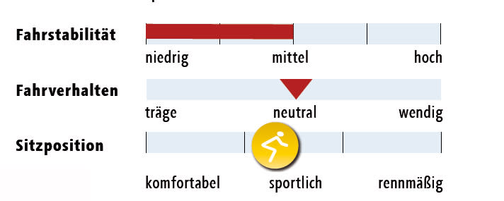 *Gewogene Gewichte; **Herstellerangabe; Testrahmengröße gefettet; ***Stack/Reach: projiziertes senkrechtes bzw. waagerechtes Maß von Mitte Tretlager bis Oberkante Steuersatzkappe