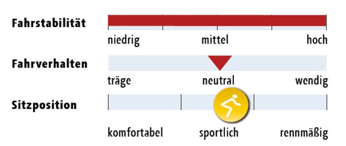 *Gewogene Gewichte; **Herstellerangabe, Testrahmengröße gefettet; ***Stack/Reach: projiziertes senkrechtes bzw. waagerechtes Maß von Mitte Tretlager bis Oberkante Steuersatzkappe