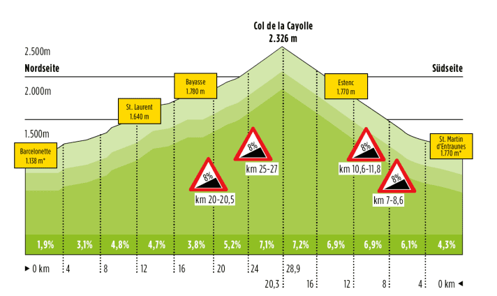 Los geht’s im hübschen Dorf Barcelonnette, einem Ort mit kurioser mexikanischer Vergangenheit: Im 19. Jahrhundert wanderten viele aus der Region nach Mexiko aus und bauten nach ihrer Rückkehr in die alte Heimat ihre Häuser im Kolonialstil. Hinter Barcelonnette verläuft die Straße parallel zum Anstieg auf den Col d’Allos, jedoch im Talgrund und ohne groß an Höhe zu gewinnen. Immer steiler aufragende Felswände kündigen bereits die Gorges du Bachelard an, die nach einem markanten Schwenk nach Osten so deutlich an Dramatik zulegt, dass der Radler kaum bemerkt, dass jetzt auch die Steigung anzieht. Aber der Cayolle ist ein zahmer Pass, selten bäumt sich die Straße mit mehr als sieben Prozent auf. Am Talschluss, im Weiler Bayasse, läuten einige Serpentinen die verbleibenden zehn Kilometer zur Passhöhe ein.