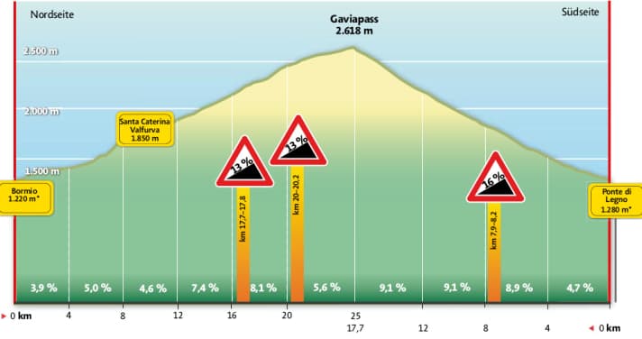 2010 markiert der Gavia zum siebten Mal den höchsten Punkt der Italien-Rundfahrt – diesmal auf der 20. Etappe. Im Unterschied zu 1988 klettern die Profis dieses Jahr über die längere, aber weniger steile Nordseite von Bormio nach Ponte di Legno. Doch egal, von welcher Seite man hinaufklettert: Beide Anstiege führen wunderschön in die hochalpine, abgelegene Landschaft im Nationalpark Stilfser Joch.