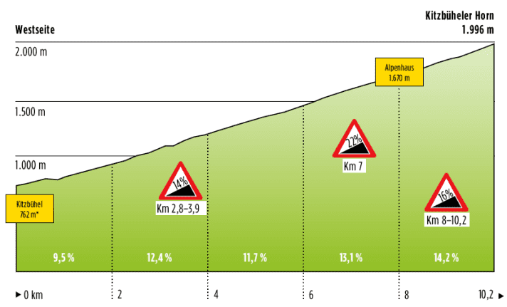 Auf zehn Kilometern steigt die Straße mit durchschnittlich zwölf Prozent, an der steilsten Stelle mit 22 Prozent. Jüngst wurde der Anstieg zentimetergenau vermessen, die Ergebnisse wurden auf einer Infotafel verewigt. Rekordjäger können zudem eine permanente Zeitmessanlage nutzen; die offizielle Strecke startet am “Höglern”, etwa einen Kilometer nach Beginn der Steigung im Tal. Deshalb unterscheiden sich unsere Messdaten geringfügig von den dortigen Angaben. Am Straßenrand kündigen Schilder Rampen an, für die kein Ritzel groß genug sein kann: 14, 16, 18 Prozent – und schließlich 22,3 Prozent an der steilsten Passage zwischen Goinger Alm und Alpenhaus. Wer da kein Rettungsritzel aufgelegt hat, wird leiden, zumal bereits sieben Kilometer in den Beinen stecken. Kurios: Die danach folgenden Serpentinen zum Gasthof Alpenhaus kommen einem geradezu flach vor; sind ja auch nur lächerliche zwölf Prozent.