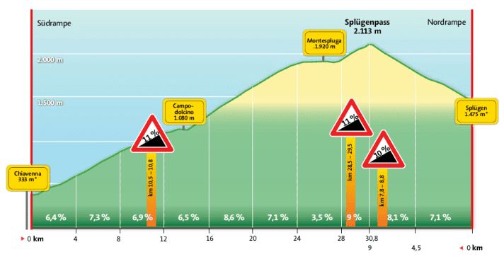 Beim Anblick der Schlangenlinien fühlt man sich ans Stilfser Joch erinnert. Doch nicht nur auf der Schweizer Seite drängt sich ein Vergleich mit der berühmteren Passstraße auf: Auf der Südrampe des Splügen erwarten den Kletterer fast genau so viele Höhenmeter wie am Stilfser Joch. Rund 1.800 Höhenmeter – das erreichen nur wenige Alpenpässe. Am Grund dieser Respekt einflößende Wand liegt auf gerade einmal 333 Metern überm Meer das malerische Städtchen Chiavenna. Biegt man dort auf die Splügenstraße ab, geht es unverzüglich zur Sache. Das Tal verengt sich dramatisch, der Asphalt neigt sich Richtung Vertikale. Kurven und Kehren lassen keine Langeweile aufkommen. Zwischen den Orten Prestone und Campodolcino – man passiert dort einen kleinen See – lehnt sich die Trasse für etwa zwei Kilometer auf etwa drei Steigungsprozent zurück und gönnt dem Radler Zeit zum Durchschnaufen. Aber nur kurz. Dann strebt die Straße ihren kühnsten Passagen entgegen und hangelt sich in Haarnadelkurven an senkrechten Felswänden empor. Auf einer Höhe von 1.900 Metern folgt ein längers Flachstück entlang des Stausees Lago di Montespluga. Nochmals Gelegenheit, um Luft zu holen, bevor der letzte Aufschwung zur Passhöhe vor einem steht – und mit ihm weitere Serpentinen. 51 werden es bis zur Passhöhe und der Schweizer Grenze insgesamt sein: rekordverdächtig!