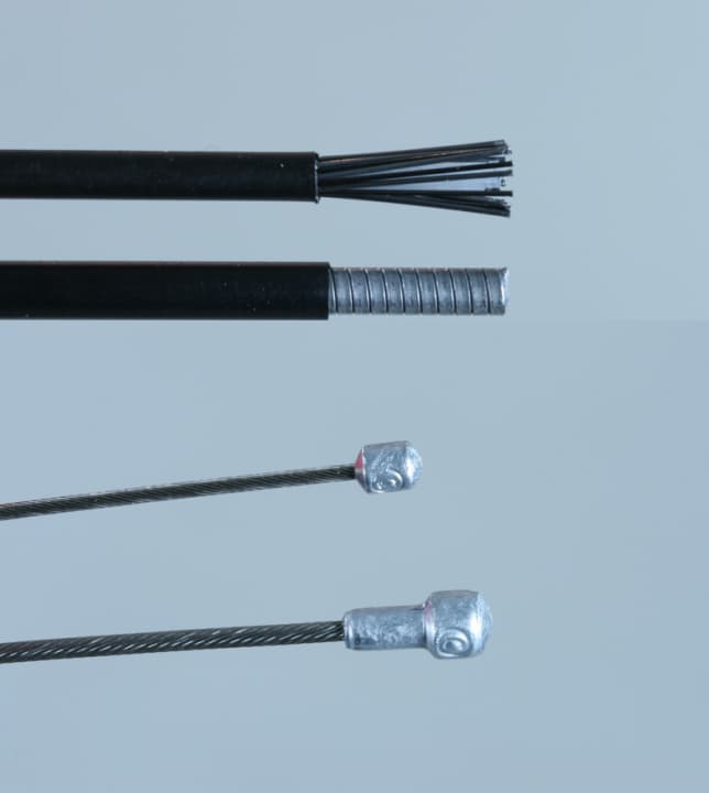 • Schalt- und Bremszüge unterscheiden sich deutlich – sie dürfen weder getauscht noch gemischt werden. Schalt-Innenzüge sind schlanker, mit einem deutlich kleineren Kopf. Schaltzug-Außenhüllen sind in Längsrichtung mit Draht verstärkt, der die Hüllen versteift, damit sie beim Schalten so wenig wie möglich gestaucht werden. Bremszug-Außenhüllen sind dagegen wendelförmig mit Stahl verstärkt, das macht sie etwas flexibler.