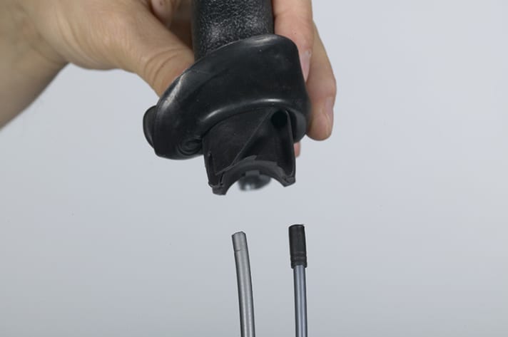 5. Die Außenhüllen der Bremszüge werden direkt, also ohne Hülse in den Griff geschoben. Achten Sie darauf, dass die Außenhüllen rechtwinklig abgelängt sind. Die Außenhüllen der Schaltzüge werden mit Endhülse verbaut. Dies ist nicht nur wegen des geringeren Durchmessers wichtig, sondern auch deshalb notwendig, damit einzelne Verstärkungsdrähte nicht in die Bohrung im Hebel gelangen und das System lahmlegen