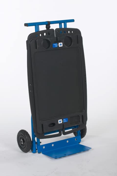 Mechaniker auf Achse und Radschauber ohne eigene Werkstatt kennen das Problem: Wohin mit Werkzeug und Komponenten, wenn man sich nicht dauernd bücken will? Eine mögliche Antwort liefert der Werkzeughersteller Park Tool. Die klappbare Werkbank ”PB-1” bietet bei einer Arbeitshöhe von 90 Zentimetern einen standsicheren, 90 x 60 Zentimeter großen Arbeitsplatz mit robuster Kunststoffoberfläche und zahlreichen integrierten Werkzeughaltern. Zur vollwertigen Freiluftwerkstatt wird die 150 Euro teure ”PB-1” aber leider erst, wenn man zusätzlich den Montage- und Zentrierständer-Kit ”PB-7” (150 Euro) und das Rollen-Kit ”PB-5” (125 Euro) erwirbt, mit dem sich der 14 Kilo schwere Tisch (Faltmaß 110 x 60 x 20 Zentimeter) leichter transportieren und zusätzlich als Sackkarre nutzen lässt. Angesichts von 450 Euro Gesamtkosten dürften sich die meisten Hobby-Schrauber wohl weiterhin bücken.